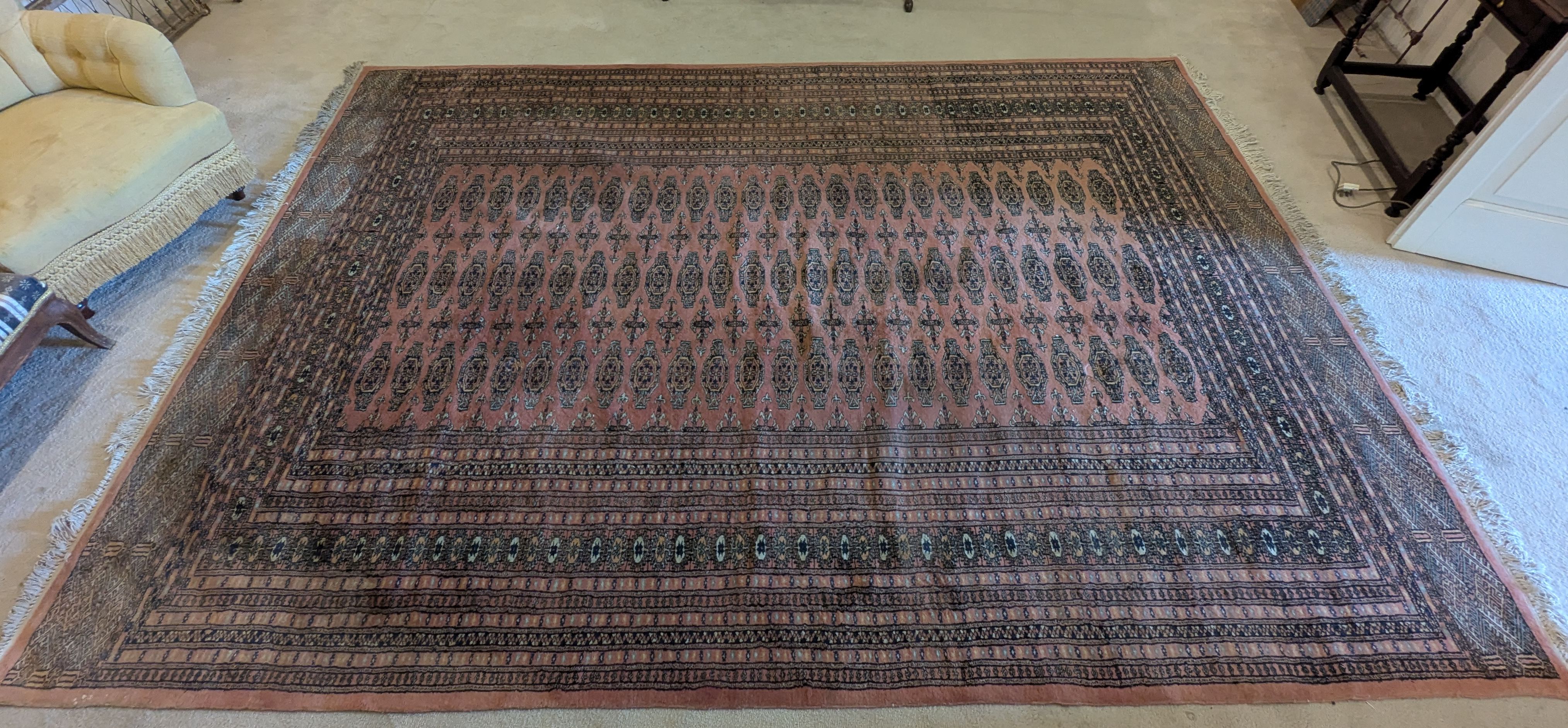 Persian hand woven carpet, Bochara, pink ground, 220 x 320cm