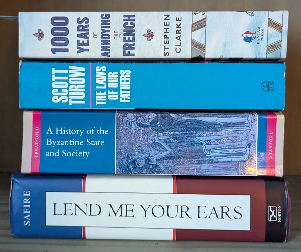 Safire William, Great Speeches in History; Treadgold Warren, Byzantine State and Society; Turow Scott, The Laws of Our Fathers; Clarke Stephen, 1000 Years of Annoying the French (4)