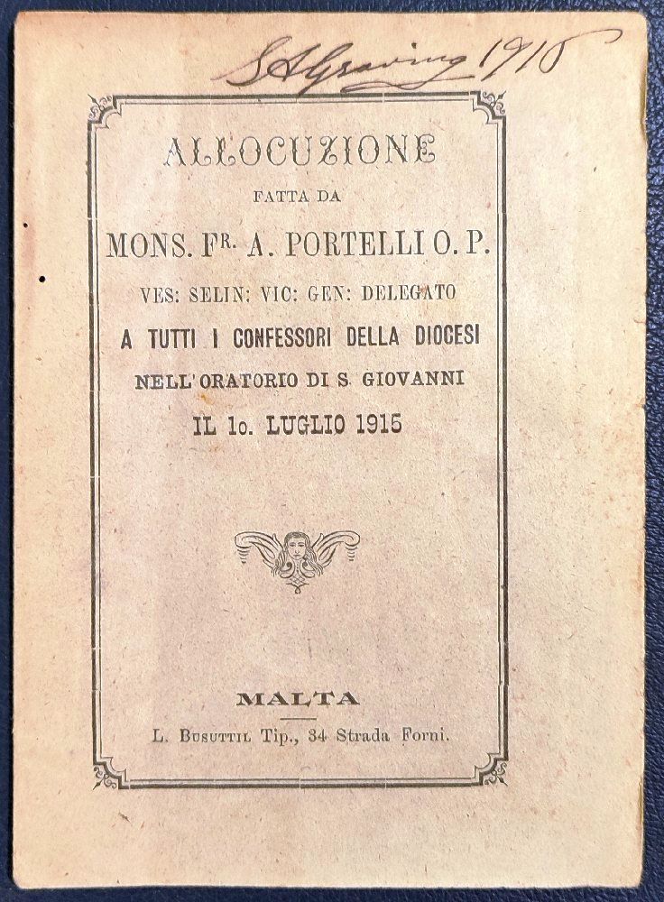 Portelli A., Fra Mons., Allocuzione a tutti i Confessori della Diocesi, Luglio 1915