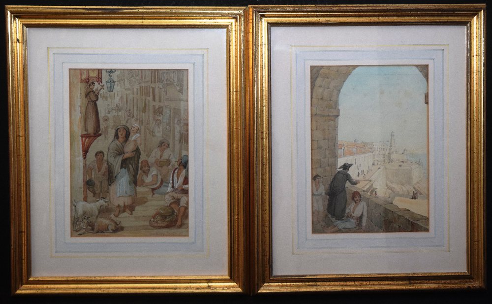 ARTHUR ABBOT (fl Mid 19th C.), 2 water-colours ‘The Fountain at Pieta’, ‘The Falletta’ and ‘Traders’ 13 x 20.5cm, framed
