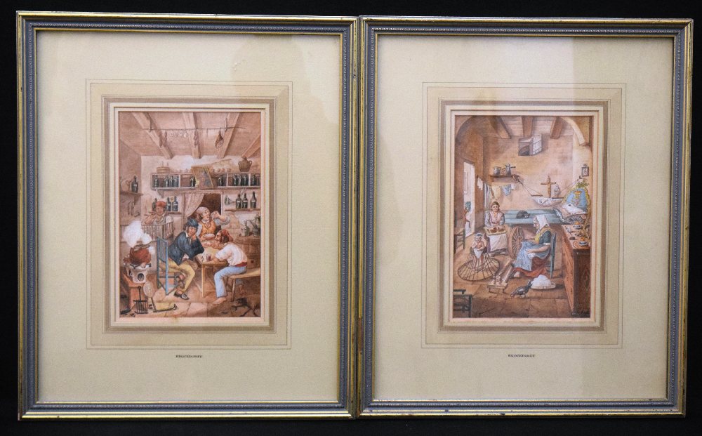 CHARLES FREDERICK BROCKDORFF 1775-1850, set of 2 water-colours: Wine Merchant Shop and Domestic Interior, signed, 16 x 23cm, framed