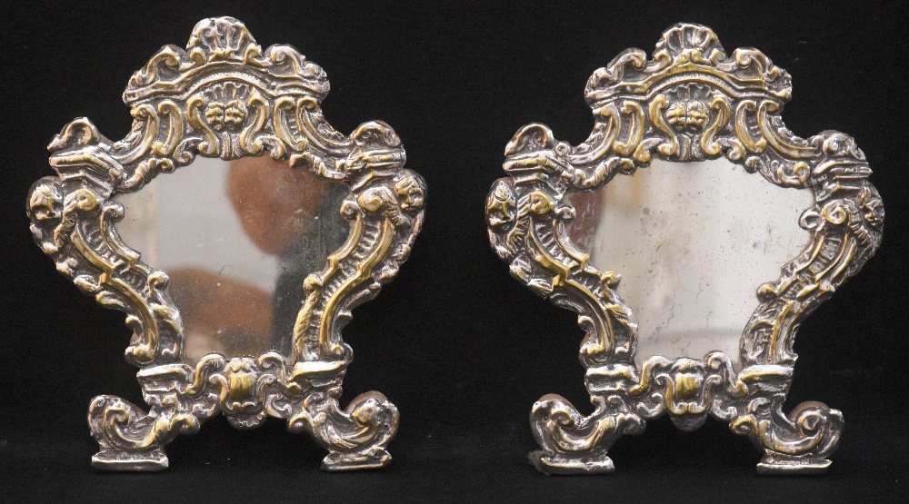 19th C. pair of altar prayer frames, embossed with scrolls and cherubs, with mirrors, 22 x 26cm