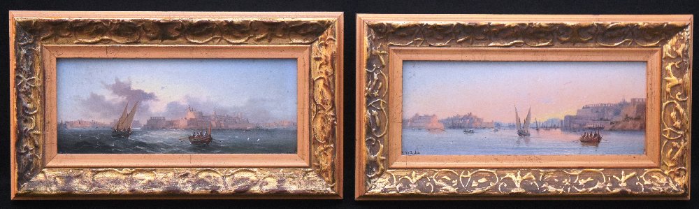 LUIGI MARIA GALEA 1847 – 1917, pair oil paintings on board: Entrance to the Marbours and Sunset over grand harbour, 27 x 11.5cm, signed, framed