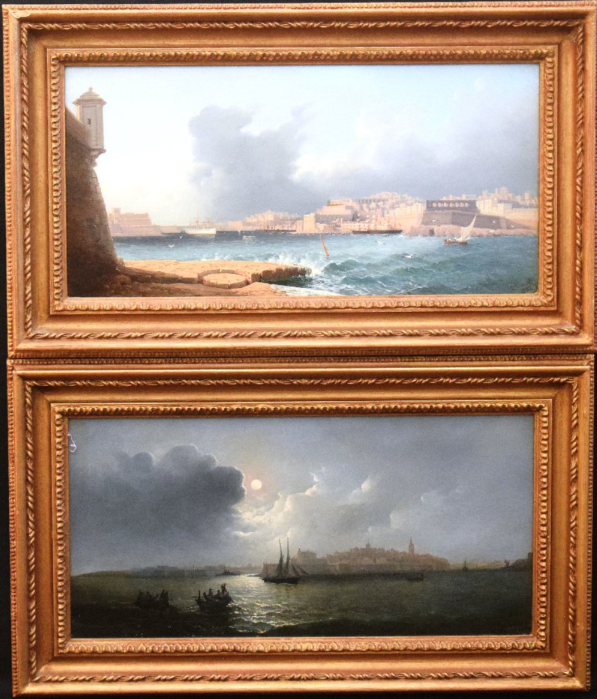 LUIGI MARIA GALEA 1847 – 1917, pair oil paintings on board ‘Moon Rise over St Angelo from Valletta’ and ‘Marsamxetto from Pieta Hill’ 17 x 23cm, framed