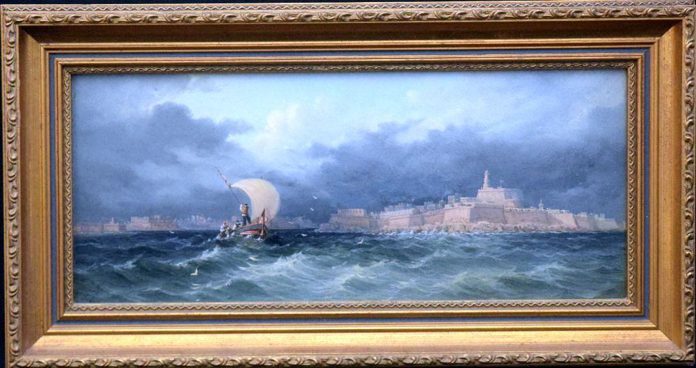 LUIGI MARIA GALEA 1847 – 1917, oil painting on artist board: Entrance to the Harbours with Fishing Boat off Valletta, 42 x 18cm, framed