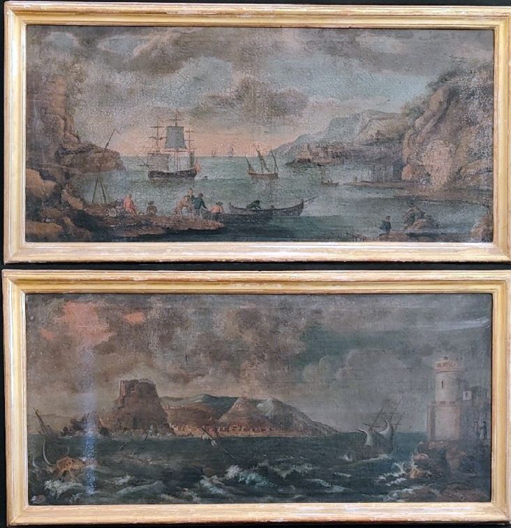 17th C. (Messina school) pair anonymous oil paintings: Mediterranean Harbours with Shipping, 97 x 45cm, in original gilt frames