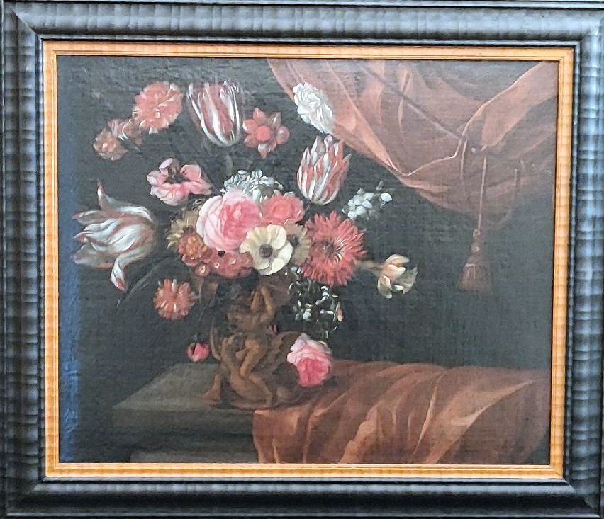Michel de Bouillon, (attributed) oil painting on canvas ‘Still Life of Flowers on a Draped Stone Console, 62 x 51c, framed