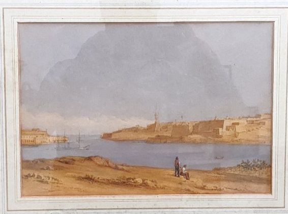 SCHRANZ .., mid 19th C. water-colour: Marsamxetto Harbour and Valletta from Manoel Island, 31 x 21cm, framed