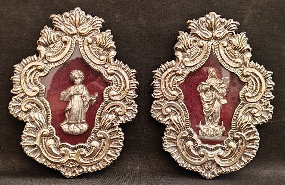 Spanish silvered pair deep ornate frames set with silvered figures of Christ Child, and, The Immaculate Conception