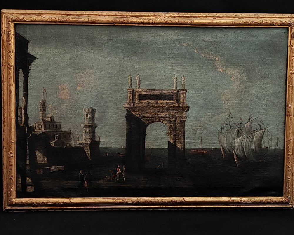 MICHELE MARIESCHI (Follower of) oil painting on canvas: Architectural Capriccio with Figures standing by a Triumphal arch on a quay, 94 x 61, in gilt frame