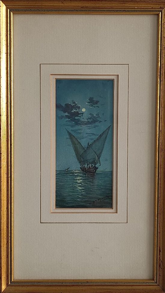 VINCENZO D’ESPOSITO, 1886 – 1946, water-colour: Sail Fishing boat by Moonlight, signed, 7.5 x 16cm, framed