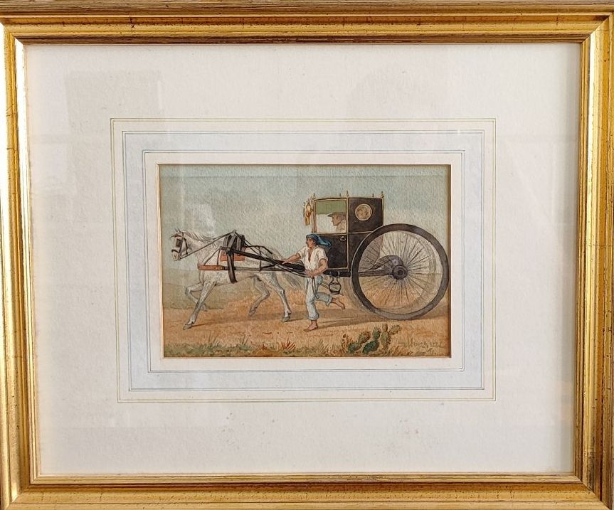 19th C. water-colour ‘Horse Drawn Cab’ 21 x 15cm, framed