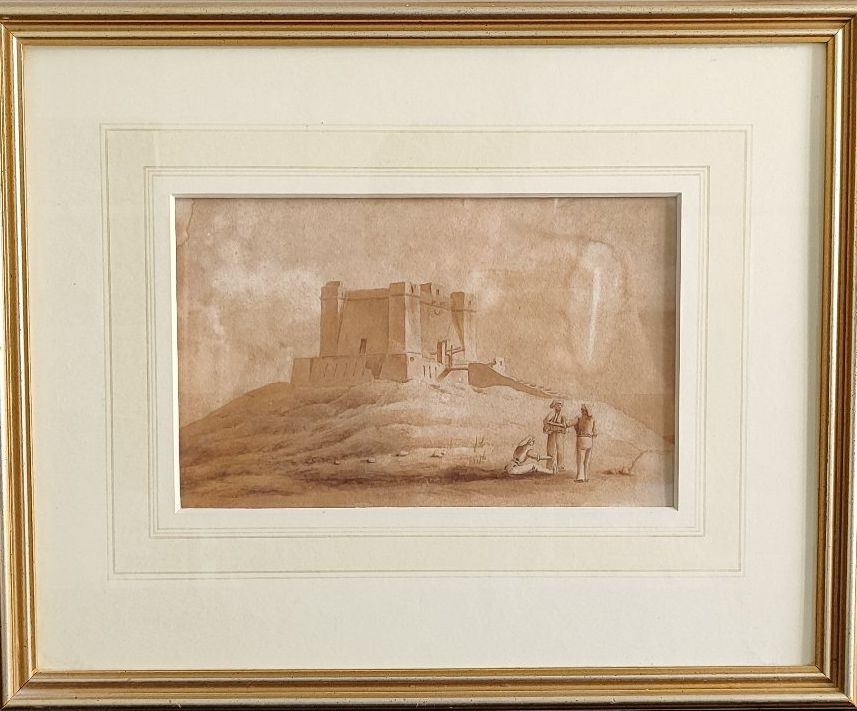 GIOVANNI SCHRANZ (attributed) sepia water-colour ‘Wignacourt Tower at Comino’ 26 x 15.5cm, framed