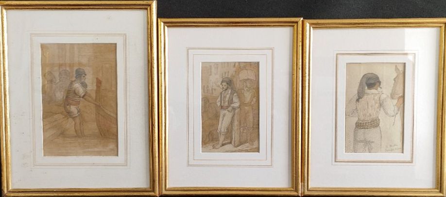 ARTHUR ABBOT (fl Mid 19th C.), 3 water-colours ‘Caless Drivers’, ‘Boatman’ and Porters’ 10 x 15cm, framed