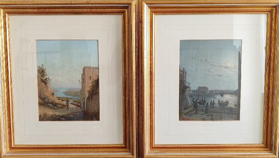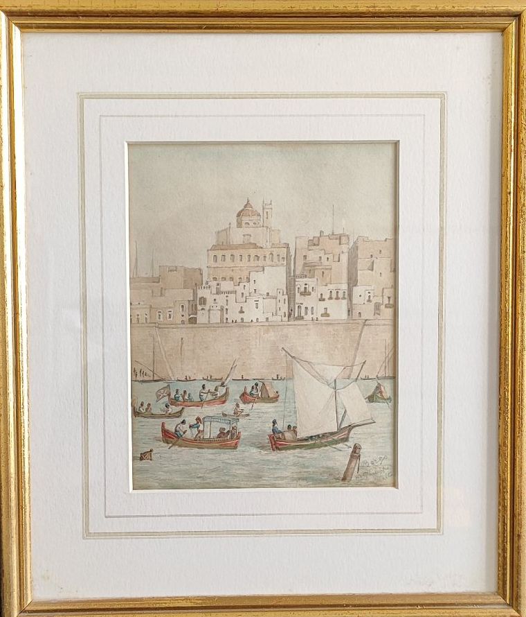 MARIA GIANNI 1873 – 1956, pair fine water-colours ‘Mdina’ and ‘Marsamxetto Harbour’ signed, 1899, 22 x 9cm, framed