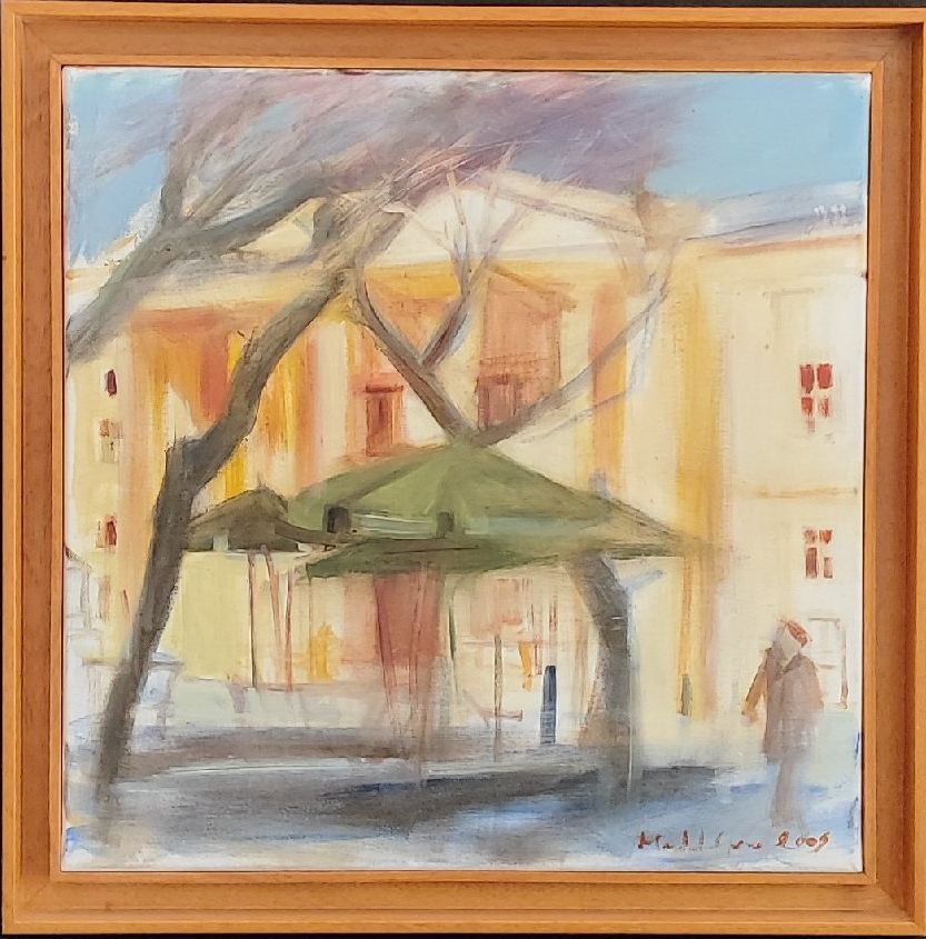 MADELAINE GERA, oil painting on canvas ‘Umbrellas in a Square’ signed, 50 x 50cm, framed