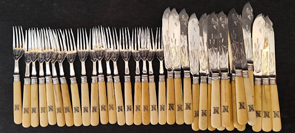 19th C. silver set of 12 fruit knives and forks with silver blades and prongs