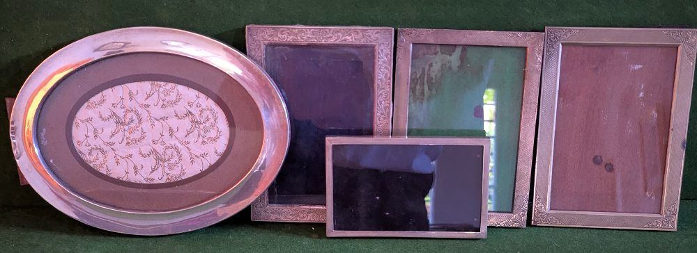 Steling silver covered telephone book; Silver framed table clock nd 2 plated photo frames