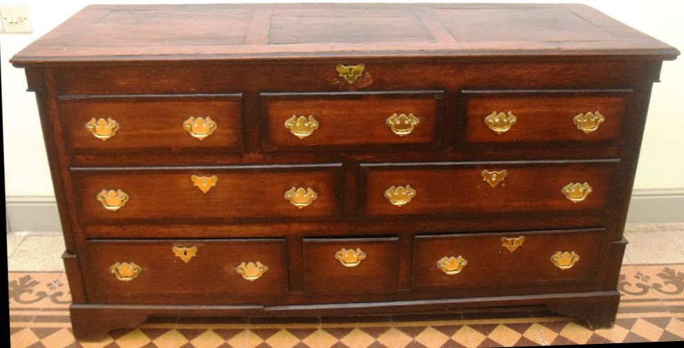 Geo IV oak and mahogany banded mule chest with 8 dummy drawers, hinged top, brass escutcheons, and bracket feet, 150cm