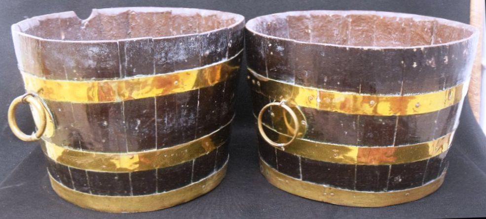 2, Early 20th C. Brass banded teak half barrels, 49 x 34cm, with ring handles