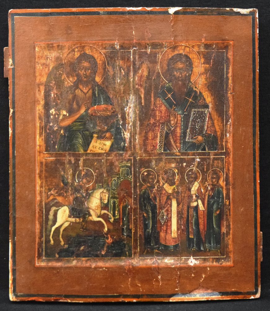 Early 19th C. Russian quadripartite icon depicting saints, 27 x 31cm