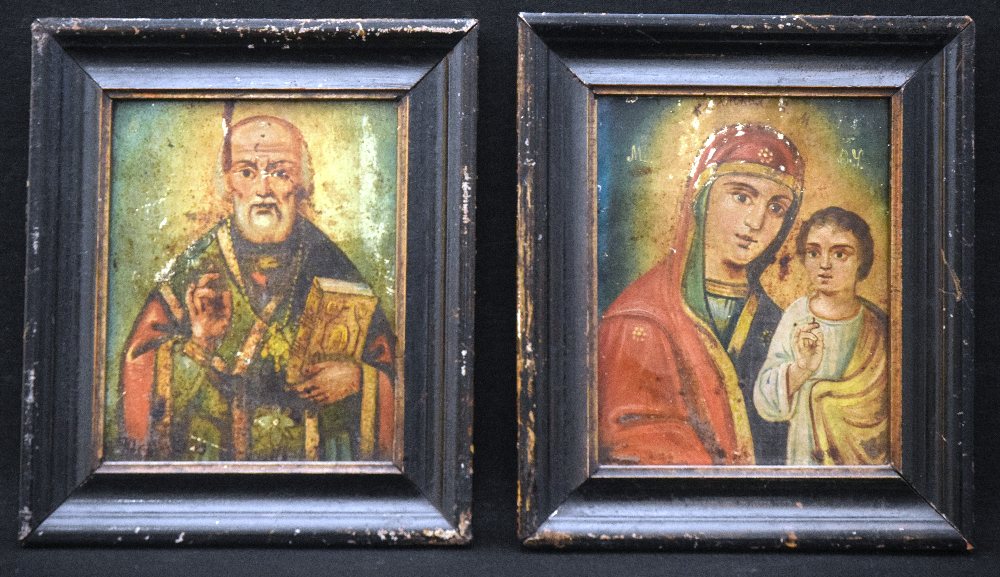2, Mid 19th C. oil paintings on sheet metal: St Nicholas and The Virgin and Child, 14 x 17cm, framed