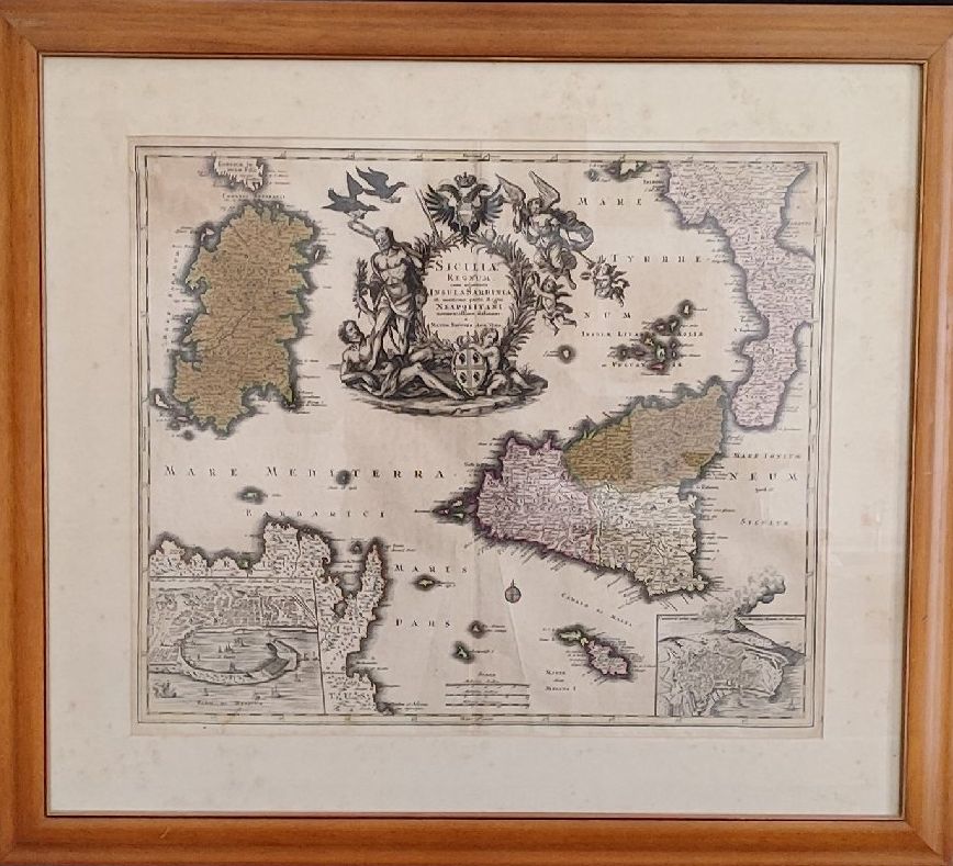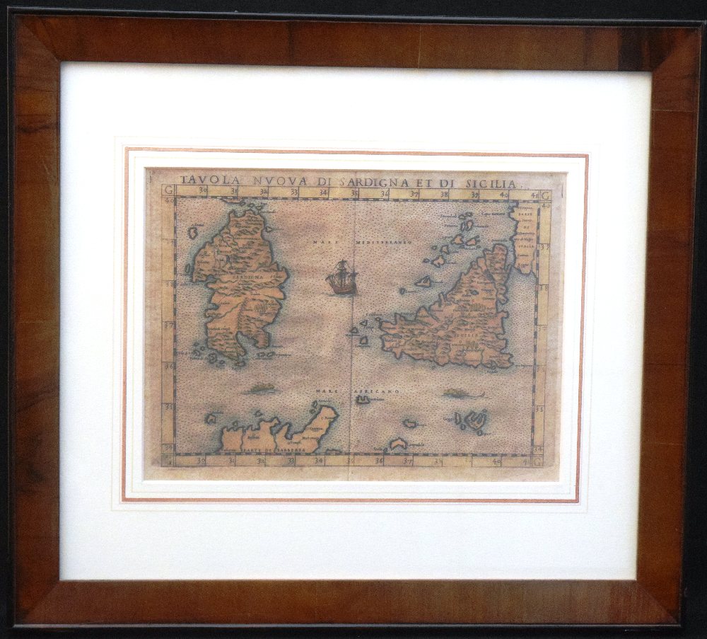 GIROLAMO RUSCELLI, map of Sicily, Malta, Sardinia, Venice 1574, 25 x 19cm, hand coloured, framed