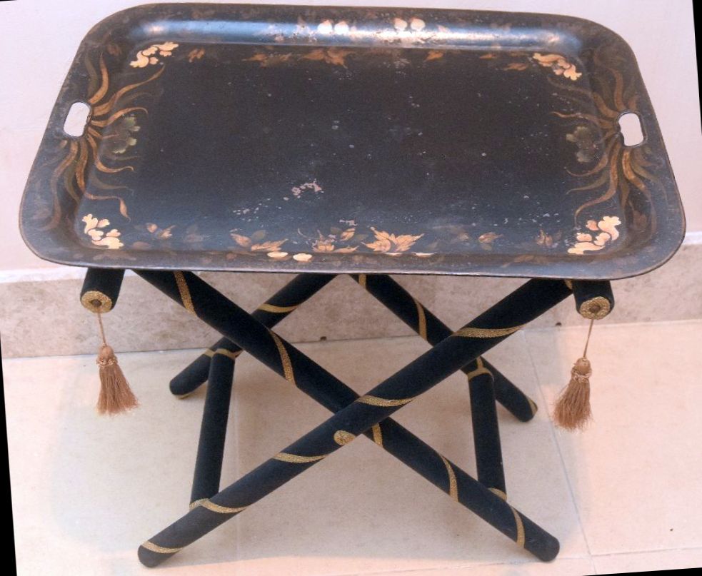 Victorian black painted serving tray 42cm, decorated with flowers, on a later folding stand