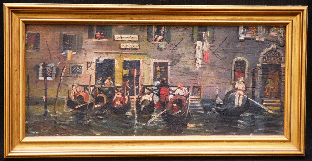 Venetian school oil painting on board: Canal, Gondolas and dwellings, 29 x 13cm