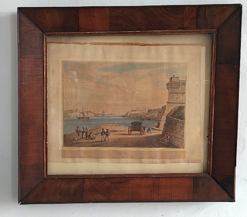 SCHRANZ Brothers lithograph with water-colour: Marsamxetto Harbour from Samaison, 36 x 28cm, in Maltese mahogany 19th C. frame