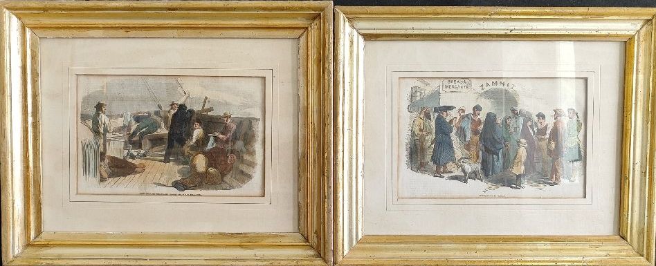 Late 19th C. 2 broadsheet prints ‘Street Scene at Valletta’ and ‘Siesta on board the Steamer’ 24 x 16cm, framed