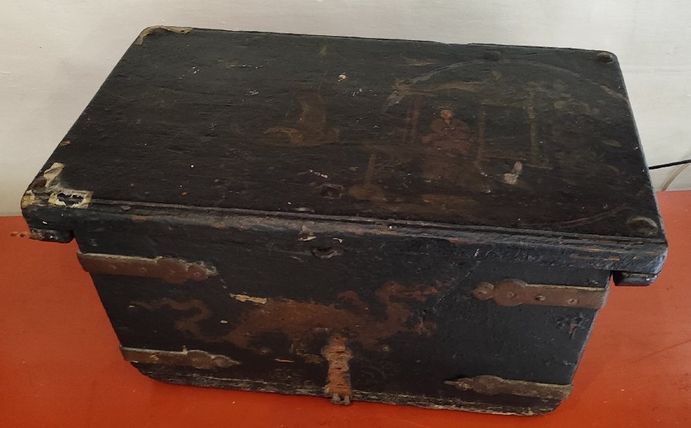 Asian hardwood black lacquer captain’s portable safe with metal bands and handles, 58 x 33cm