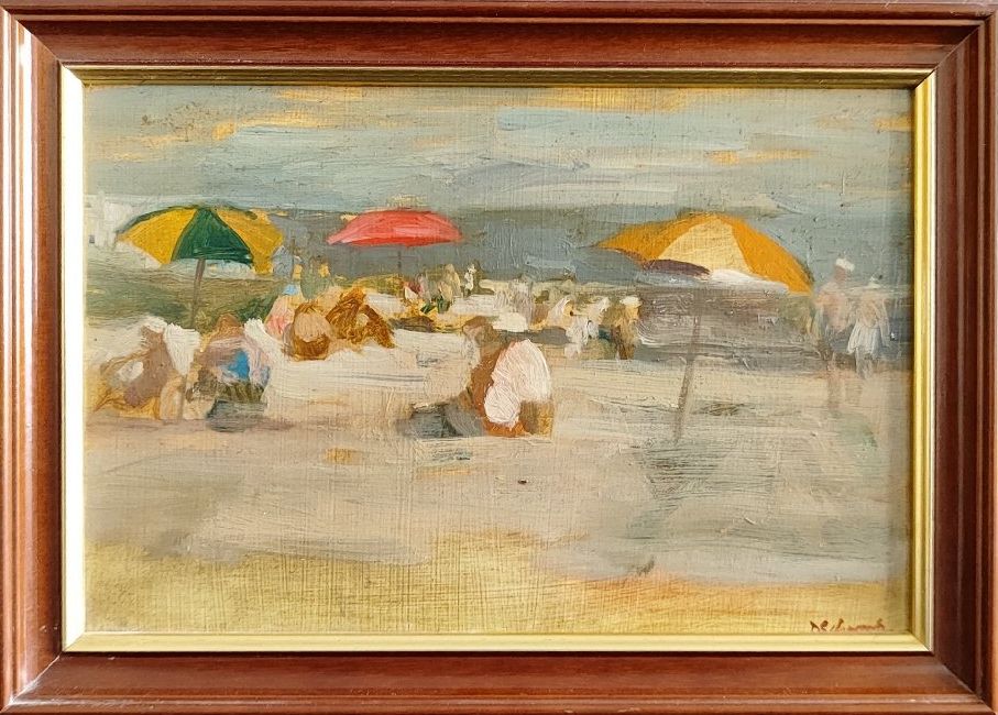 Oil painting ‘Beach Umbrellas and Bathers’ 22 x 14cm, signed, framed