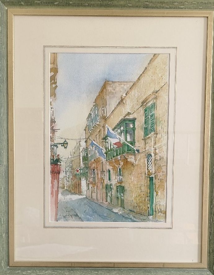Water-colour ‘The French Embassy, Valletta’ (Former residence of Judge Caruana Curran) 28 x 40cm, framed