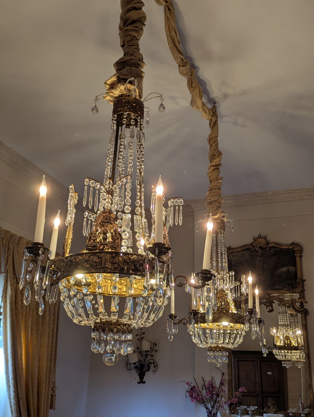 19th C. Empire rare pair chandeliers, gilded metal having 6 candlelights (converted to electricity) suspended basket crystals and bead chains, 95cm