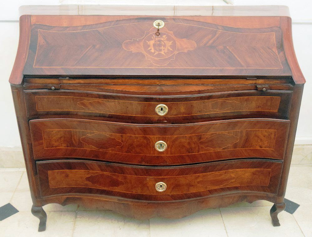 18th C. Maltese olivewood slope front bureau with string inlay and Cottoner coats of arms in oval medallions, 3 serpentine drawers, concave sides and hoof feet, 148cm