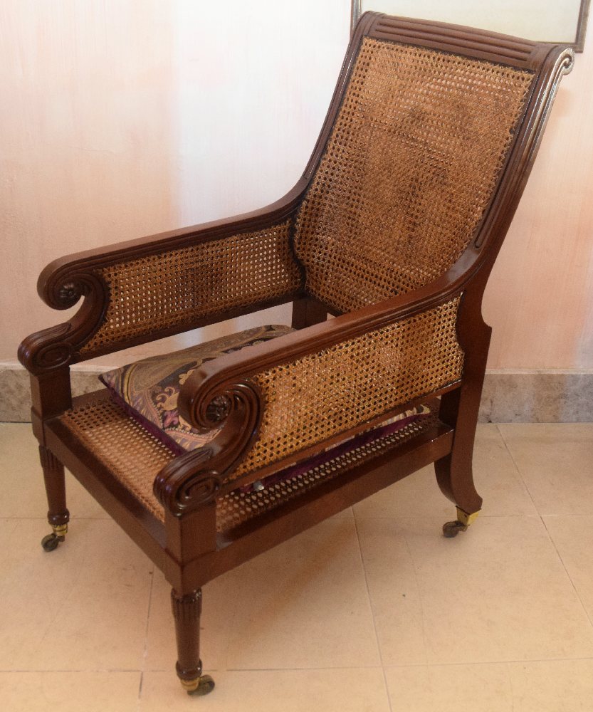 Edwardian mahogany bergere library armchair with scroll arms, fluted legs with brass castors