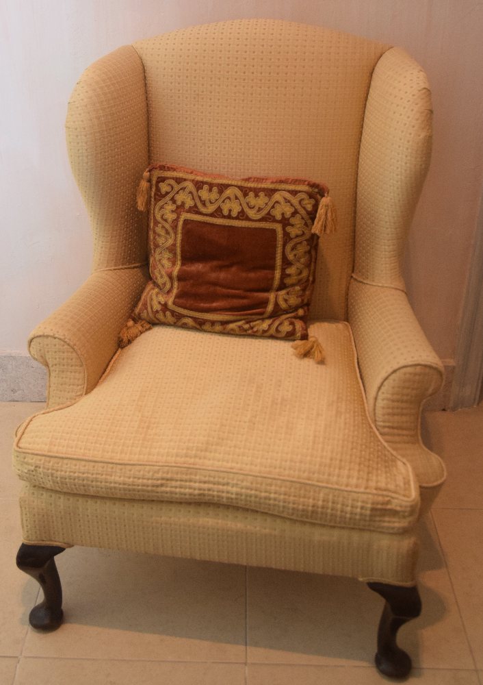 Upholstered wing back armchair on cabriole legs
