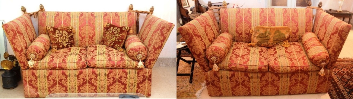 Edwardian KNOWLE pair settles upholstered in damask on brass casters, circa 1910, with drop down arms, and gilt acorns and tassles – and set gold Venetian cushions
