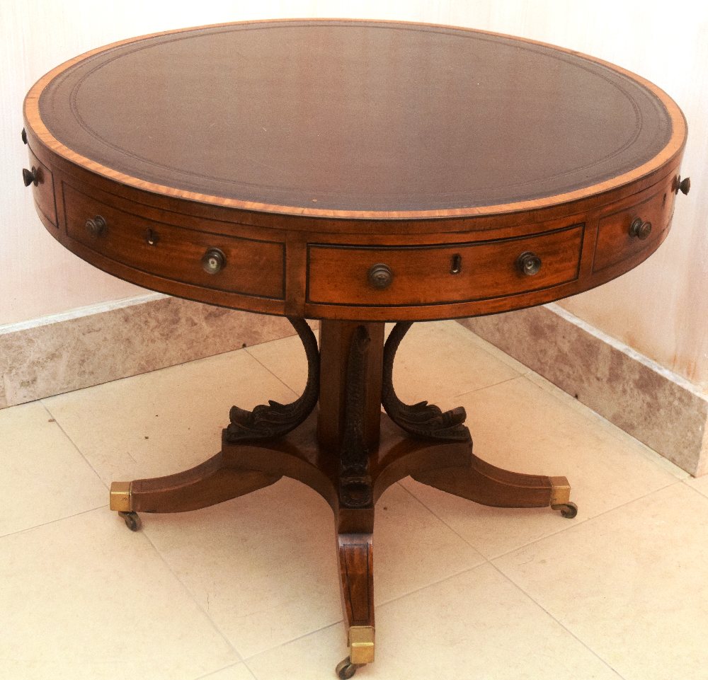 English Regency mahogany drum top table with 4 drawers, on column with carved ebonised fish, brass toe castor, 92cm