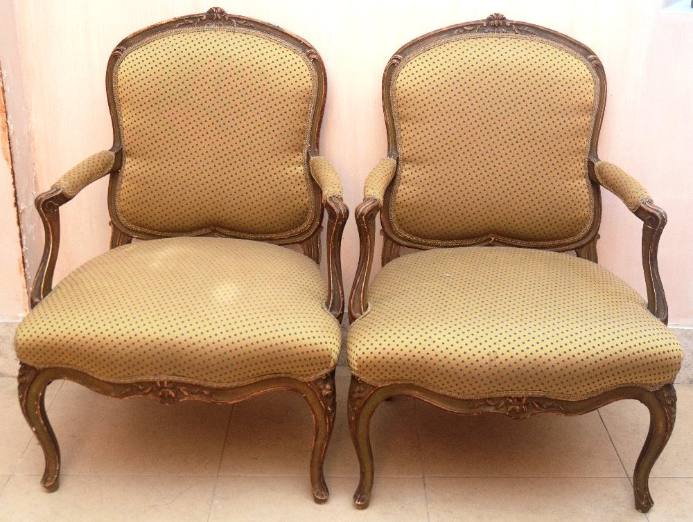 Early 20th C. Louis XV style pair armchairs painted in green and gilt, with silk upholstery