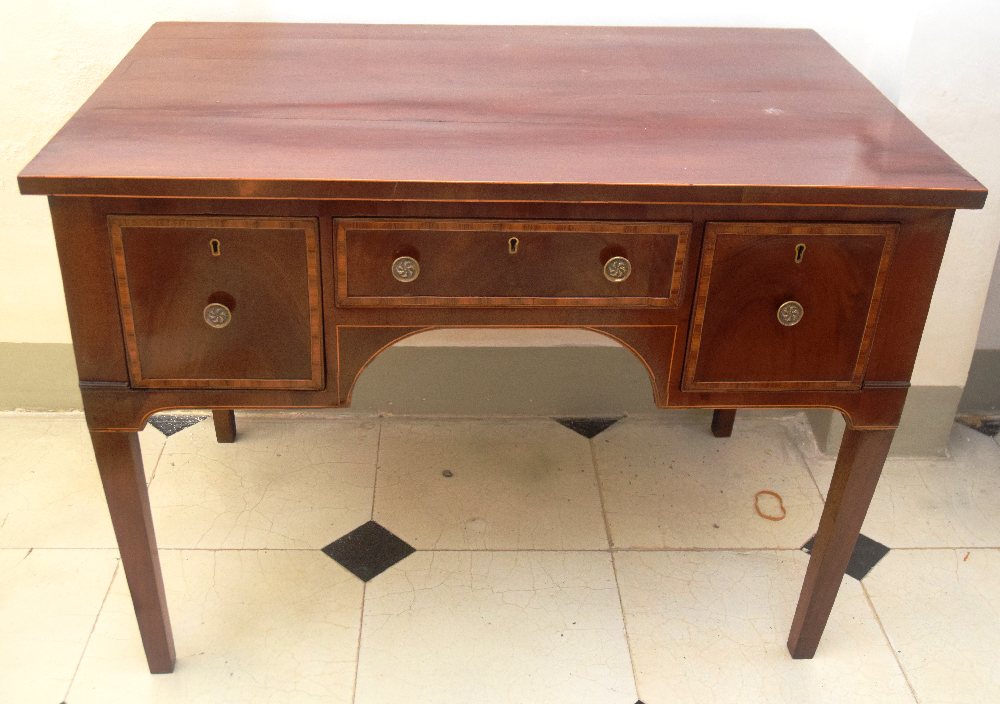 Mid 19th C. mahogany and satinwood banded writing table with 3 drawers, on square tapered legs, 106cm