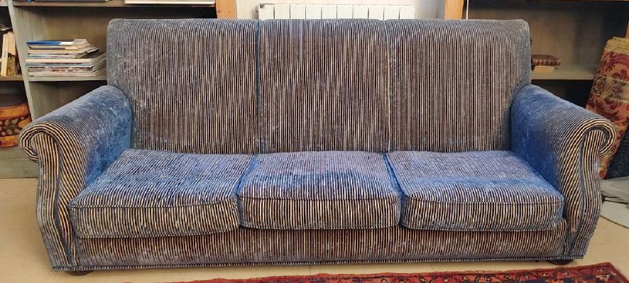 FORTUNY 3-seater sofa upholstered in midnight blue & gold corded velvet, Chesterfield type, with 3 midnight blue velvet Venetian fringed cushions, 200cm