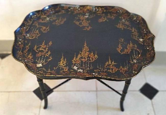 Regency papier mache table tray in black lacquer with inlaid mother of pearl and painted flowers, 80 x 62, on an ebonised bamboo style base
