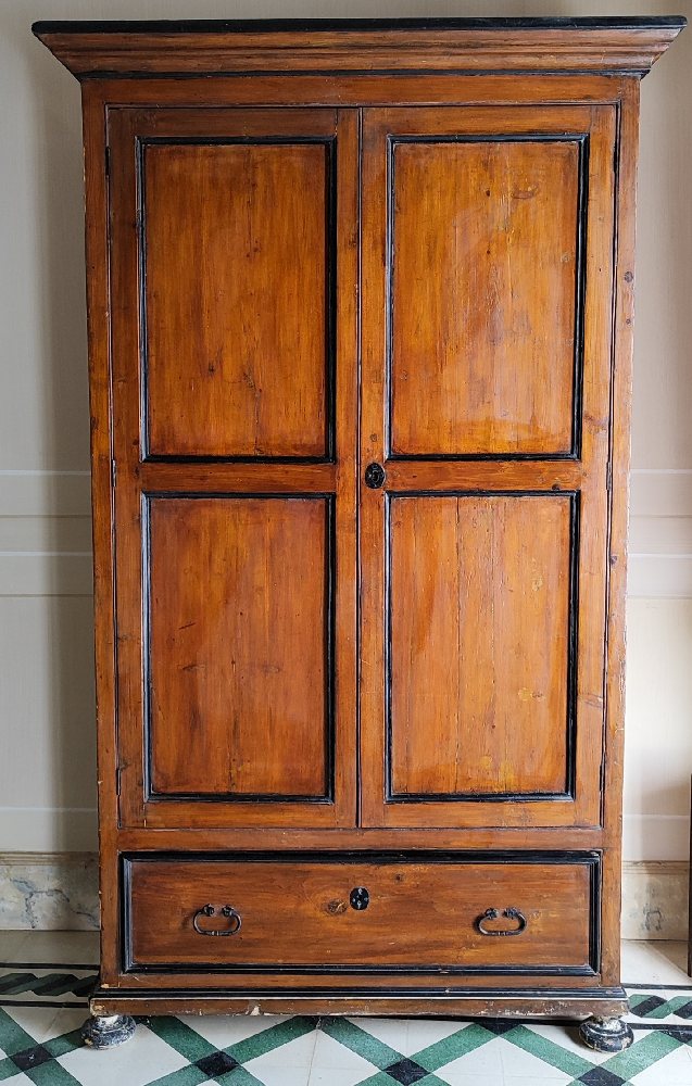 Late 19th C. Maltese stained woof 2-door cupboard with lower drawer, iron handles and bun feet, 125 x 215cm