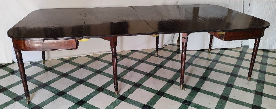 Mid 19th C. English mahogany D-end dining table on turned legs with castors, having 2 removable leaved supported on gate legs, 243 (124) x 122cm