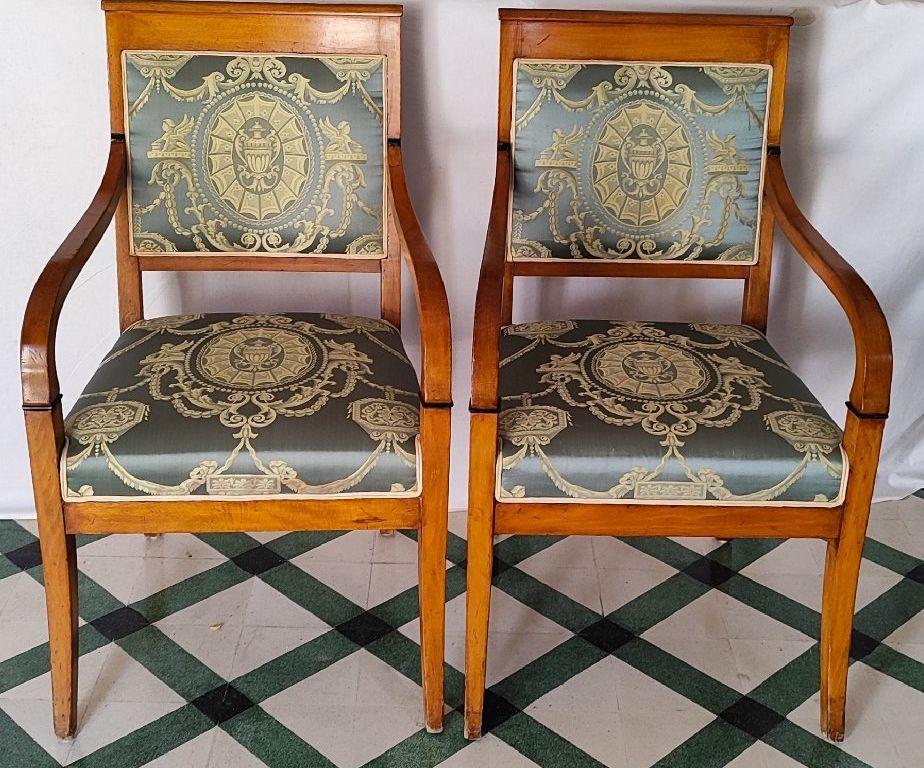 Set of 12, 20th C. dining carvers with PIERRE FREY upholstery (white protective covers), on sabre legs