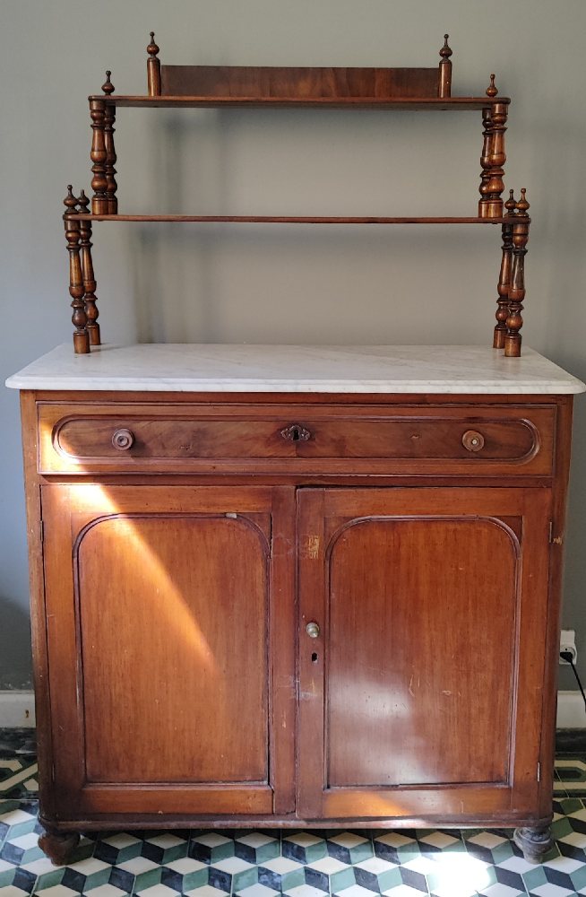 Victorian mahogany chiffonier with marble top and raised stepped shelves, 112cm