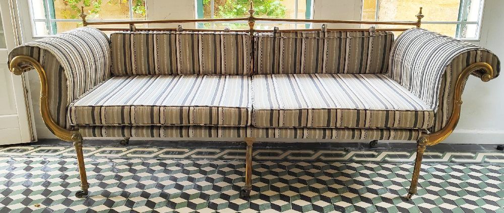 19th C. French Napoleonic brass campaign bed on dismantlable wood and iron base, with cushions, 220cm