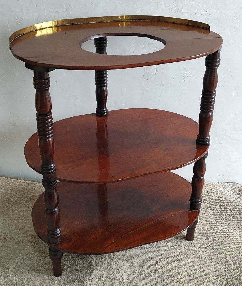 Mahogany oval 3-tier wash stand with brass top gallery, on turned columns, 66cm (with a glass dish)